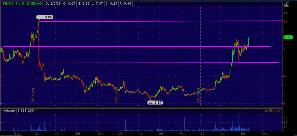 Investors who have been long since MNKD was trading below $2 (as we recommended over a year ago), would do well to book some gains, or consider a covered call strategy to lock in profits. While a short term run to $10 or above is not out of the question, profit taking is to be expected after the data release.