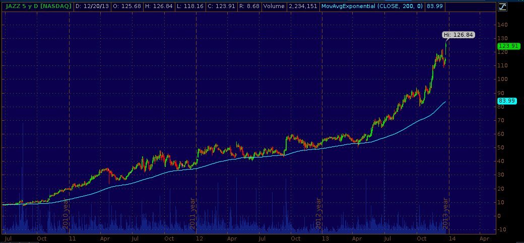 and here is the 5-year chart for JAZZ (data from TD-Ameritrade, click to enlarge):